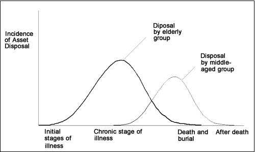 Long illness and death is primarily among the middle aged although it occurs in all age groups. For this reason, financial burden of such illness and death, are felt, in the first instance, by the middle-aged. This age group feels the financial impact of long illness at an earlier stage of illness than other groups. This age group tended to respond to the demands of the initial stages of illness out of its own resources. In many cases, the middle-aged continue to apply their own resources in response the demands associated with the earlier phases of the chronic stage of illness. The general trend of spending in response to the medical requirements progressed as follows: