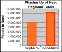 up until the next main harvest in April/May. From September through November, there are an estimated 10 million people in need of food assistance, which will increase to 14.4 million from December through March 2003. Rural households that are most vulnerable