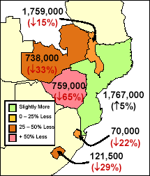 Compared with the past five-year average, 2001/02 cereal production at the national level was down notably in the six countries included in the assessments, with the exception of Mozambique (see map). The most severe drop