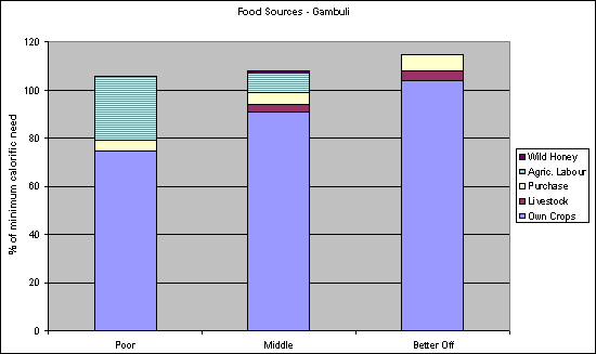 Sources of food for Gambuli were found to be similar to those in Chihwiti. However, the shares from each source differ, with those in Gambuli realizing quite a lot of their food requirements from own crop production. The chart below represents the percentages of food requirements the different wealth groups get from every source: