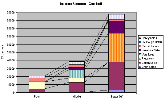Comparing Chihwiti and Gambuli, it can be seen that each of Gambuli’s wealth groups is somewhat better off than their counterparts in Chihwiti. (Gambuli’s “poor” earn more than Chihwiti’s poor group, but less than their middle, etc.) There are some differences in income sources between the two settlements. For example, gold panning and remittances were significant in Chihwiti, while wild honey sales were a significant source of income in Gambuli. Cotton sales were also seen to be important as a source of income for the two settlements.