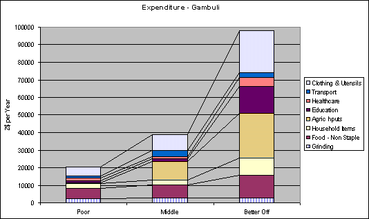 There are very significant differences between the groups in relation to spending on education and agricultural inputs, however. The big jump in spending on education between the middle and better off occurs because typically only the better off send their children to secondary school, where costs are much greater (fees, uniforms, and transport or boarding expenses, as the nearest secondary school is at Kenzamba, approximately 20km away).